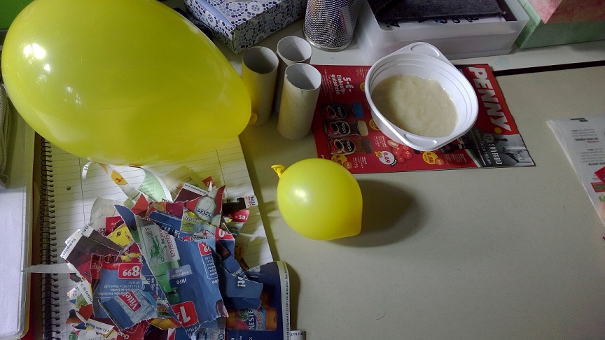 Bevor man mit dem Bau der piñata anfängt, muss man sich erst für die Form entscheiden. Wir haben uns für ein Kaninchen entschieden. Als nächstes nimmt man den Luftballon, pustet ihn auf und knotet ihn zu. Nachdem man das Zeitungspapier in viele kleine Teile gerissen hat, kann man anfangen, den Luftballon mit dem Zeitungspapier zu bekleben. Es ist wichtig, dass man 2-3 Schichten auf den Ballon klebt, sonst ist die piñata später nicht stabil genug und fällt auseinander.