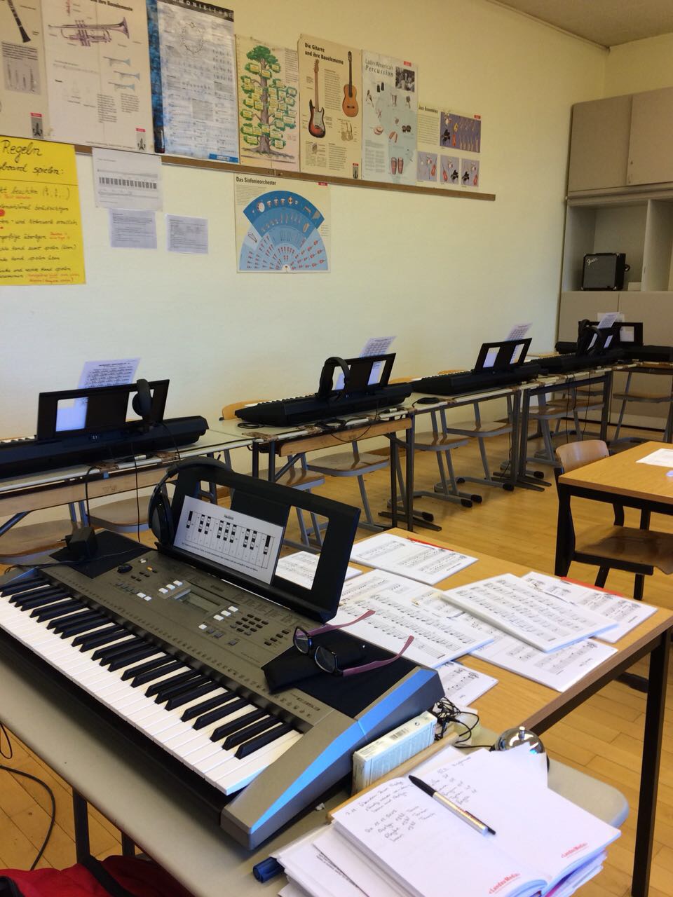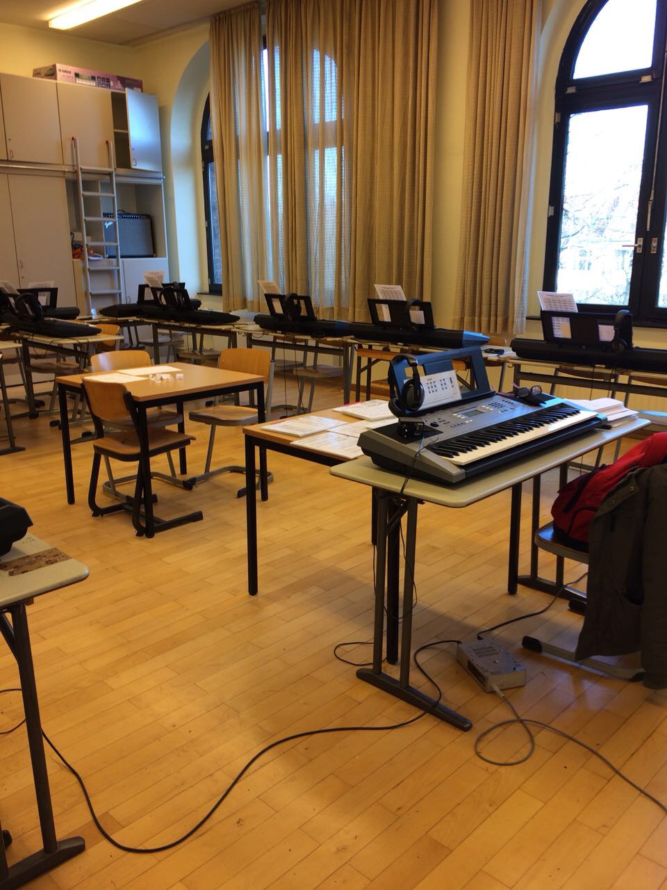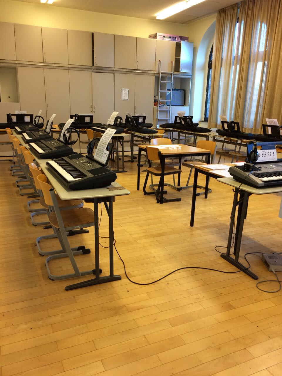 Es wird bei uns fleißig in die Tasten gehauen. Hier seht ihr unseren Keyboardraum:
