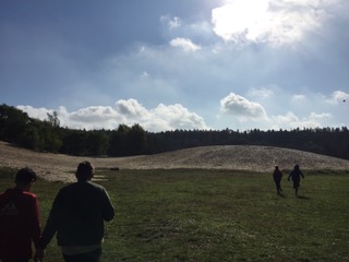 Zwischendurch haben wir immer kleine Pausen gemacht. Nach einer Stunde laufen kamen wir am Highlight des Ausfluges an. Ein riesiger Sandberg – die Sandgrube im Jagen 86. Alle rannten direkt den Berg hoch, um ein Wettrennen zu machen und zu sehen, wer zuerst wieder ankommt. Es hat großen Spaß gemacht. Wir rannten etwa 45 Minuten den Berg hoch und runter, dann war aber auch Schluss mit unserer Kondition.