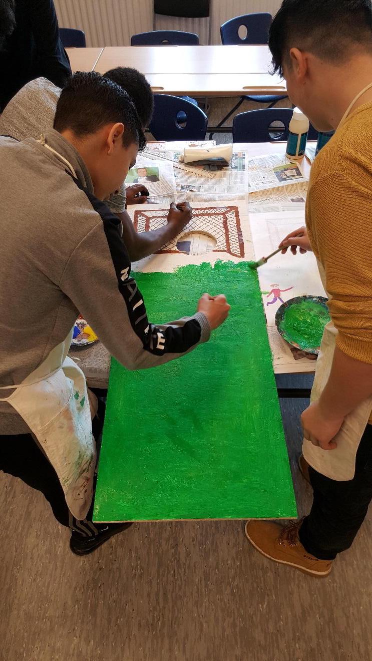 Nach einem ersten Planungstag sind am Projektdienstag acht Schüler aus Gruppe A ins Bauhaus gefahren und haben eine Holzplatte geholt, aus der die Box gebaut werden sollte. Die starken Jungs waren, als sie die schwere Holzplatte hochtragen mussten, total erschöpft und mussten danach erstmal eine Runde schlafen gehen. In den folgenden drei Tagen wurde mit vereinten Kräften gesägt, geschliffen, gemalt und geschraubt, bis die neue Pfandbox am Freitag endlich fertig war.